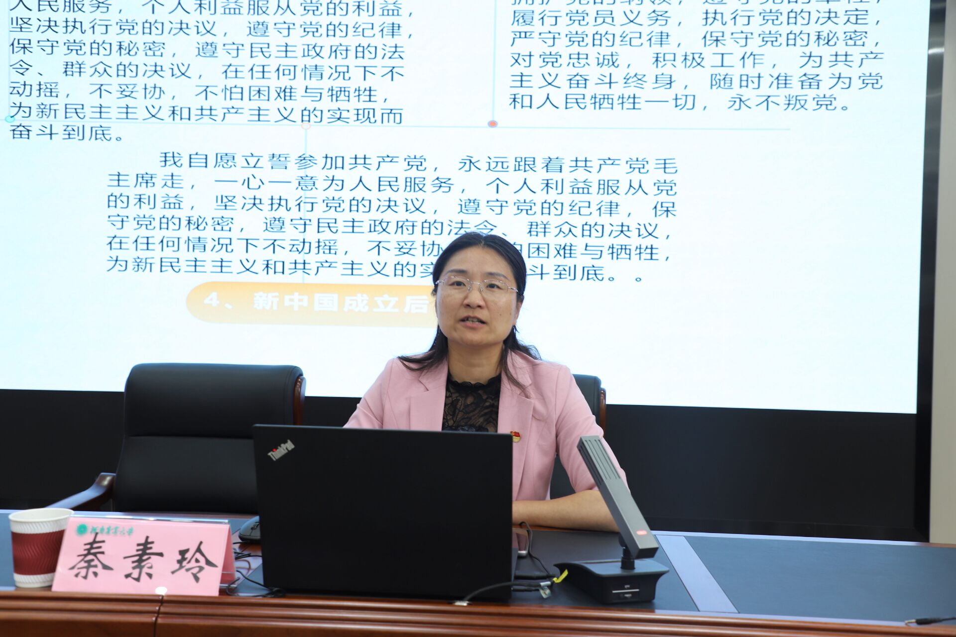 秦素玲以“牢记党员身份,让青春在现代化建设征程中绽放绚丽之花”为主题,从牢记入党誓词,做坚定的马克思主义信仰者;把稳底线之舵,做学纪知纪明纪守纪的模范践行者;坚持知行合一,做社会主义现代化建设的奋进者三个方面为毕业生党员上“最后一堂党课”。她指出全体毕业生党员要时刻按照党员的标准严格要求自己,在政治上“稳立场”,不断提高政治判断力、政治领悟力、政治执行力;在学习中“提内秀”,努力增强践行党章党规和习近平总书记系列讲话的理论自觉;在工作上“树雄心”,切实提高围绕党员身份发挥作用的主动性;在作风上“讲正派”,做新时代的担当者和创造者;在生活上“知慎独”,坚决拒绝各种诱惑。