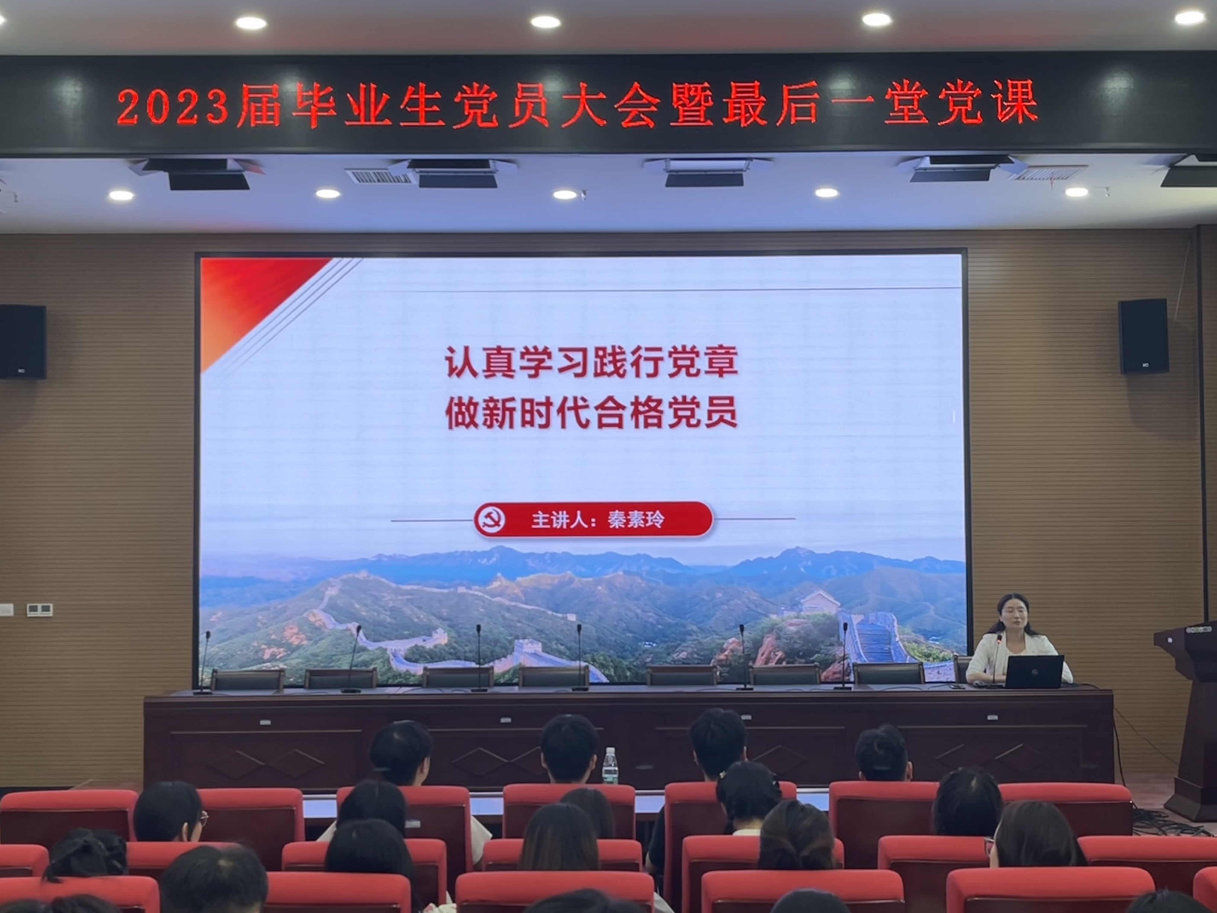 院党委书记秦素玲以“认真学习践行党章,做新时代合格党员”为主题,从中国共产党党章的历史沿革、学习贯彻《中国共产党党章(修正案)》、重温入党誓词牢记党员的义务和权利、习近平总书记对合格党员的要求以及党员的自我成长等5个部分为毕业生党员开展了离校前的最后一堂主题党课教育报告。通过讲解历次党代会对党章的重大修改内容、学习党的二十大通过的《中国共产党章程(修正案)》,提醒同学们要时刻牢记党员的权利和义务,要按照党员的标准严格要求自己,有品行、讲奉献、有作为,向优秀的党员学习看齐,要在政治上“稳立场”,不断提高政治判断力、政治领悟力、政治执行力,做政治上的明白人;在学习中“提内秀”;努力增强践行党章党规和习近平总书记系列讲话的理论自觉;在工作上“树雄心”,切实提高围绕自己的党员身份发挥作用;在作风上“讲正气”,答好人生的每一道题,走好人生的每一步路,争做新时代的担当者和创造者,在建设社会主义现代化强国的道路上,做出自己的贡献。