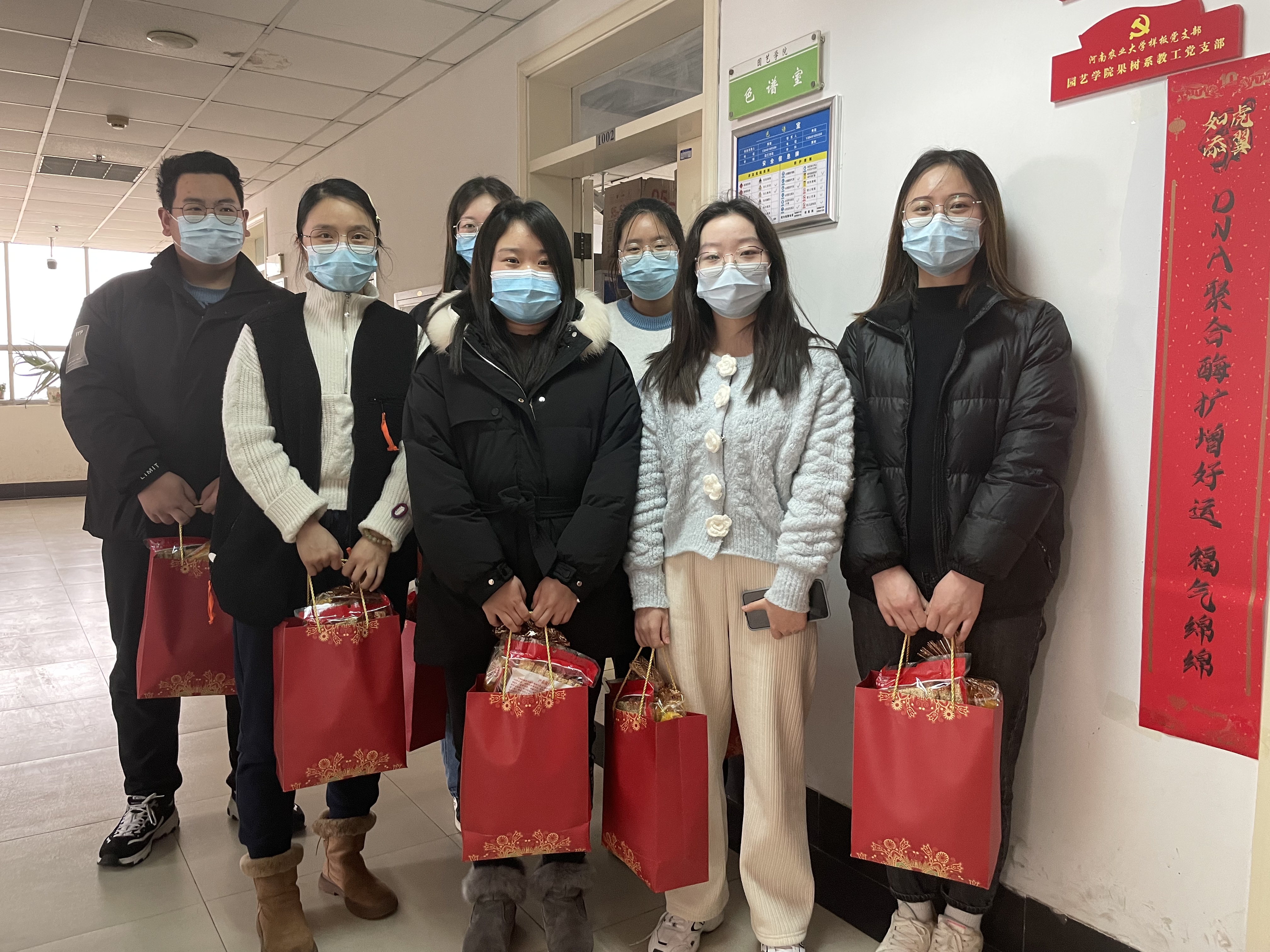 学院领导为同学们送上麻糖、水果等新年礼包,仔细询问了同学们寒假期间的实验、生活情况,勉励因疫情影响无法正常回家的同学,要及时调整状态、积极投入科研实验工作,鼓励同学们要充分利用好这段时间,好好学习、充实自己,并注重身体锻炼,做到劳逸结合。院长孙守如说:“虽然你们农历小年不能与家人团聚,但学院也是一个温暖的大家庭,老师就是你们的家人。”