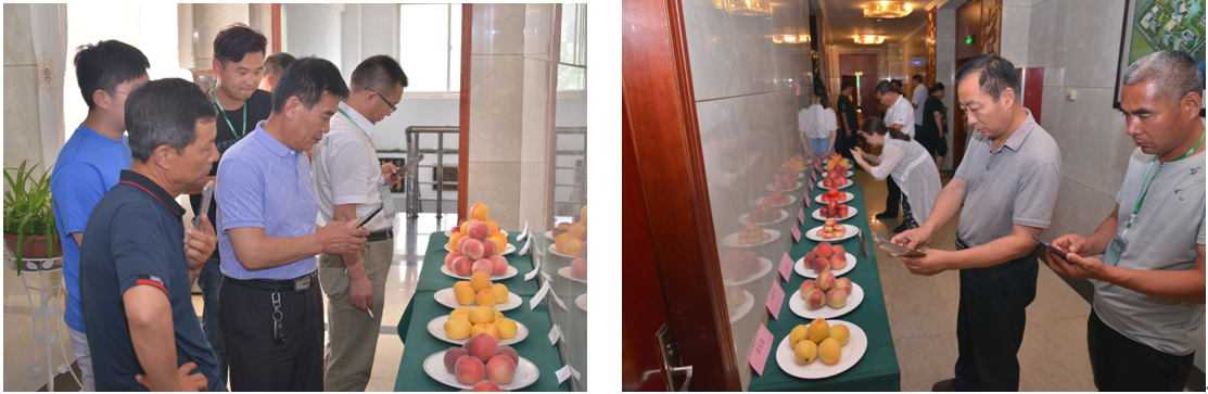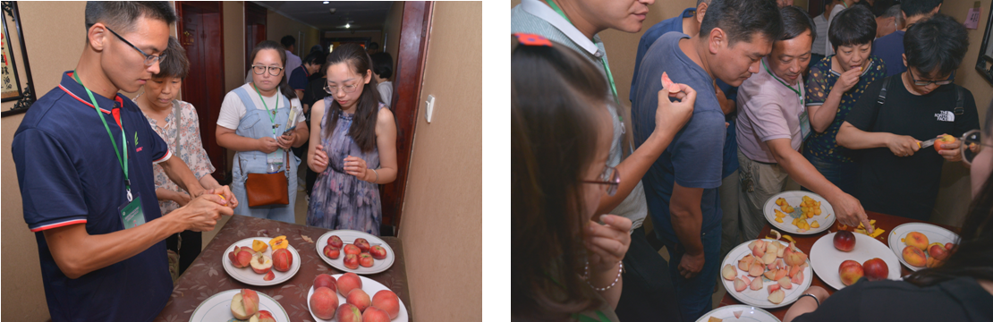 会议休息期间,会务组组织了参会人员对参赛样品进行了品鉴,大家对参赛桃的外观及风味赞不绝口,真可谓饱尝了一场桃的视觉及味觉的盛宴。