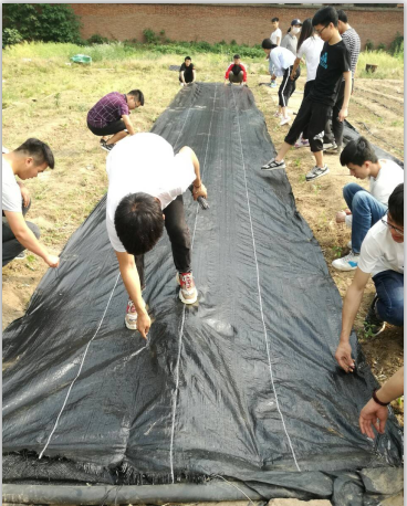听过老师的指导后,同学们开始用铁锹和耙子锄草、整地,男生与女生分工合作,效率也越来越高。除草、施肥之后,开始定植辣椒、黄瓜、茄子。紧接着在大家的通力配合下,同学们完成了覆盖地膜、固定地膜、浇水等任务。为了方便后期的管理,将农场的小路也覆上了地膜。在这酷热难耐的天气里,同学们早已是汗流浃背,但他们更渴望用辛勤的汗水换来累累的硕果。