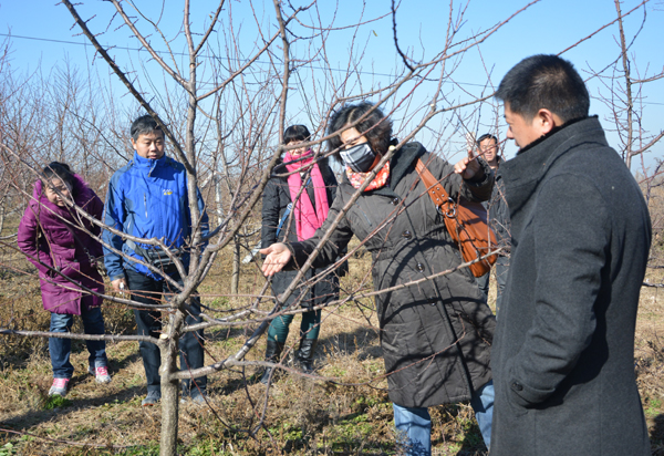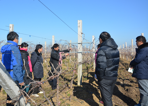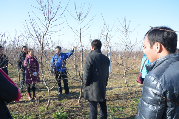 老师们每到一处果园,先选定一株果树,确定一种树型,针对枝条的去留,大家各抒己见,共同修剪一株“示范”树,形成统一的修剪整形方法,并让年轻老师执剪操作,先行练习,熟练技术,掌握技巧。葡萄的修剪比较简单,按照“1干2主12枝,枝上保留2到4”的原则修剪后将枝蔓均匀地分绑在铁丝架上即可。而桃和杏的修剪相对就比较复杂,桃的萌生力较强,整形虽然简单,但修剪任务量较大;杏树树龄较大,来年郁闭度较密,虽然整成主杆树形,但还要疏散分层。梨树的萌芽力较弱,不能轻易动剪,“高产不高产,开角是关键”只要设计好树型,把紧挨着的枝条按照一定的空间位置拉开即可。所有这些修剪经验和技巧,让部分年轻老师们受益匪浅,虽然寒风瑟瑟,泥泞粘满了双鞋,但老师们都兴致盎然,特别是那些很少拿剪枝剪的年轻教师,更是专心致志,不停尝试。