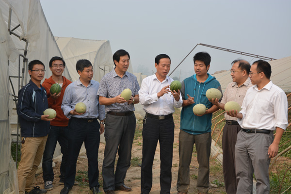 王朋朋首先向学校领导和老师详细地介绍了创业园近期的运营情况和下一步的工作打算,引导参观了正值收获期的彩虹西瓜、豫甜脆甜瓜大棚和叶菜、蒜苗生产大棚。随时介绍着每一个大棚的密植模式和今年的预计收益,还说由于今年春上一季收益很好,当地有20余家农户也跟随他们建了30多个大棚,都取得了很好的经济效益,最近正在计划与“北京老菜馆”集团合作,联手进行绿色蔬菜生产基地建设,利用自己的技术优势壮大实力,扩大规模,把农大品牌作大作响。