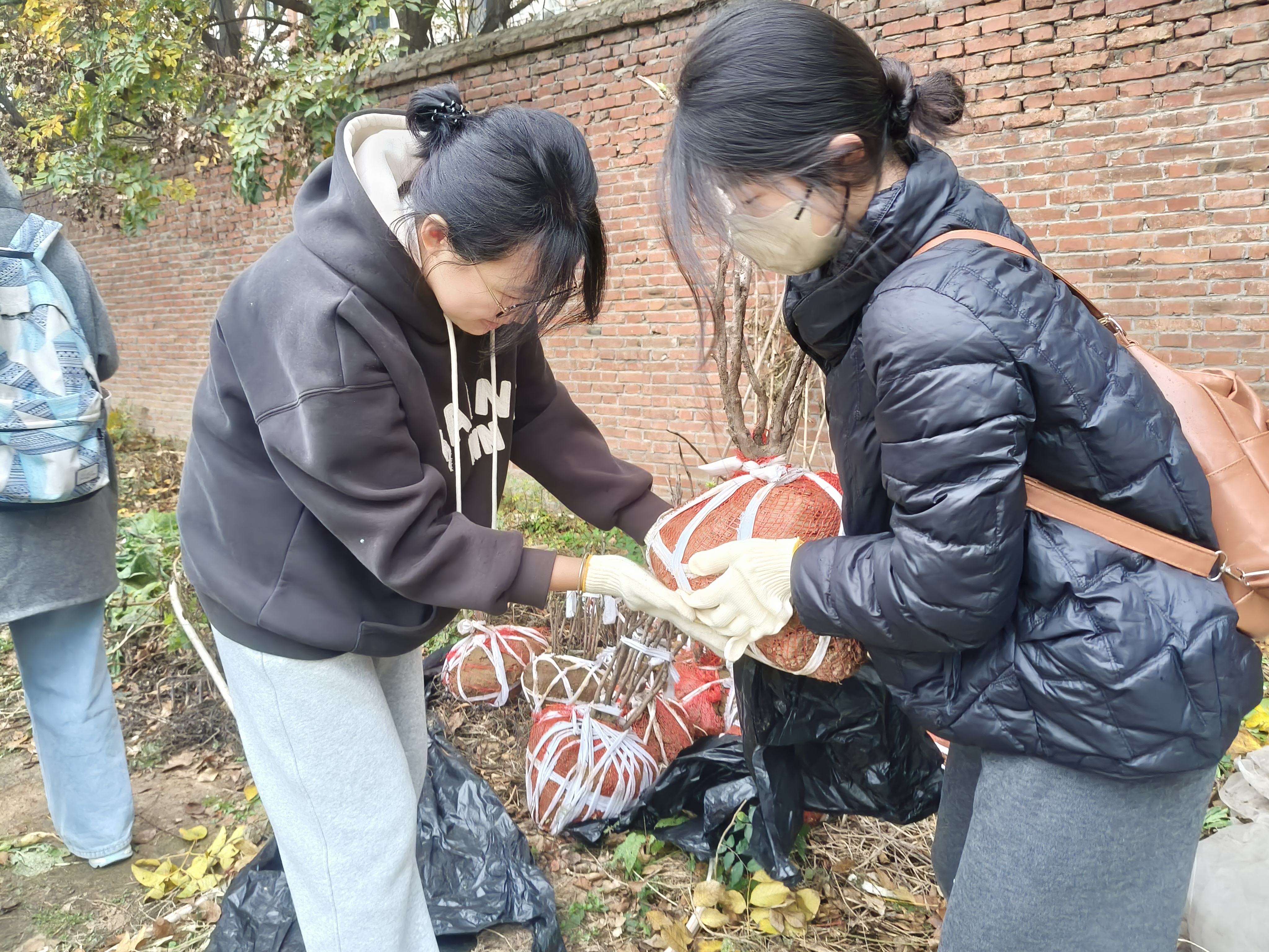 活动伊始,郭鑫向学生讲解了牡丹种植时间的特殊性以及牡丹地栽的步骤,强调了本次劳动教育活动的纪律和注意事项。随后,在他的示范和指导下,学生领取工具分小组进行劳作,一系列的翻地、放牡丹苗、拆网袋、填土等劳动,一个个牡丹苗安然地躺入大地的怀抱,一片空地变成了整齐的牡丹带,只待冬季的低温春化唤醒新生。活动最后,全体同学合影留念。