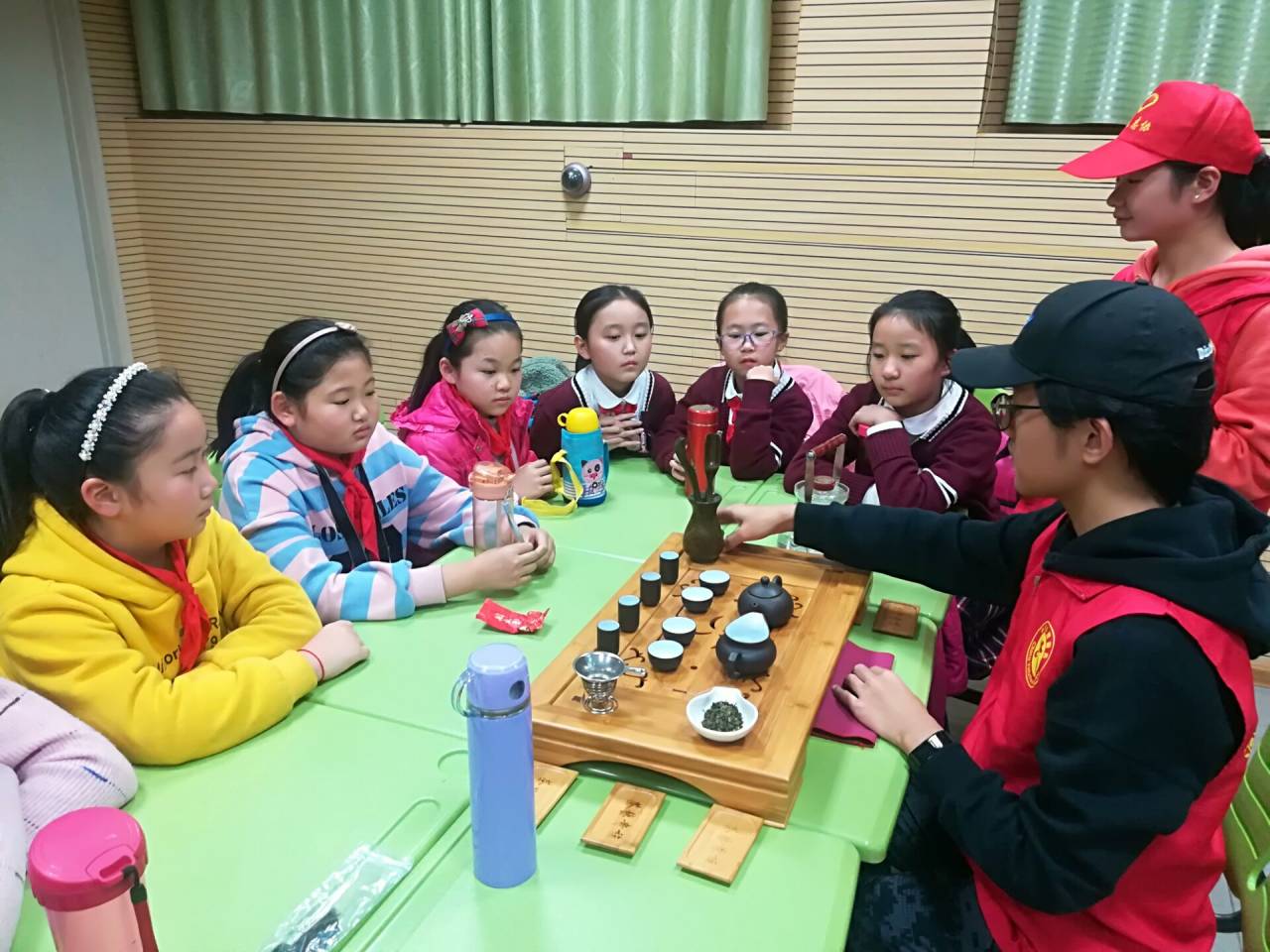 下午两点,在支部书记陈桃老师带领下,我院茶学专业学生党支部十五名学生志愿者来到春晖小学,开展志愿服务活动,此次活动以“认识五颜六色的茶”为主题,分为茶文化知识普及和茶艺展示两个环节。首先,志愿者为孩子们讲解关于六大茶类的起源和茶的冲泡品饮的小知识。在老师的帮助下,我院志愿者为孩子们现场冲泡了六种不同的茶叶:霍山黄芽、滇红、茉莉花茶、白牡丹、铁观音、普洱茶,并邀请学生们到讲台上闻其不同的茶香和识别不同茶的汤色,学生们积极参与,热情高涨。接着,志愿者们为学生们演示了紫砂,盖碗,玻璃杯的茶技表演,小朋友们被志愿者们精彩的才艺表演和有生动的讲解所吸引。期间,孩子们认真观看并对其中的技巧进行询问,志愿者们对此一一耐心细致地回答。随后,我院党支部师生与春晖小学老师和学生亲切交流,认真聆听小朋友们的趣事,解决他们在学习和生活上的小烦恼。最后,我院茶学专业学生党支部与春晖小学师生合影留念,志愿工作到此结束。