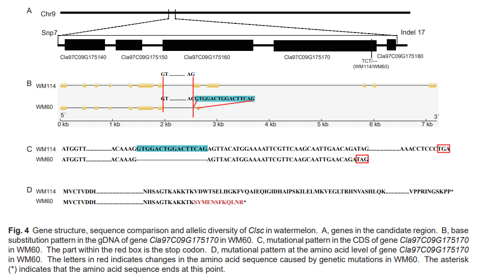 遗传分析结果表明,WM60的浅色条纹性状由一对隐性基因控制,命名为Clsc。随后。通过构建F2群体基因混池和连锁分析的方法,将控制西瓜果皮条纹颜色基因定位到9号染色体上一个147.6 kb区间内。结合基因组重测序、转录组测序、表达量分析、结构变异分析和基因功能注释等信息,将Cla97C09G175150基因选定为候选目的基因。