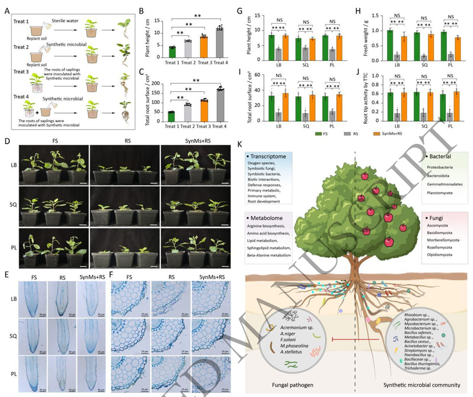 近日,我院苹果逆境生物学与简约技术栽培体系团队郑先波教授、焦健教授在Horticulture Research(中科院一区,影响因子8.5)发表研究论文“A synthetic microbial community derived from healthy apple rhizosphere alleviates apple replant disease”,系统阐明了苹果再植病的微生物驱动机制,并提出以合成微生物群落(synthetic microbial community, SynMs)缓解苹果再植病的新模式。