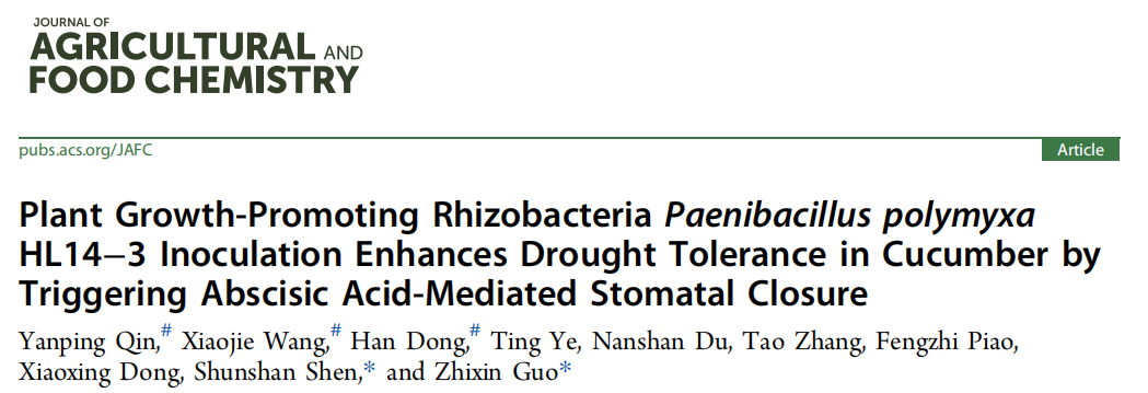 Journal of Agricultural and Food Chemistry(中科院1区Top,IF=5.7)在线发表。该研究筛选到一株能够有效提高黄瓜抗旱性且在干旱胁迫下能够稳定定殖的植物根际促生菌多粘类芽孢杆菌(
