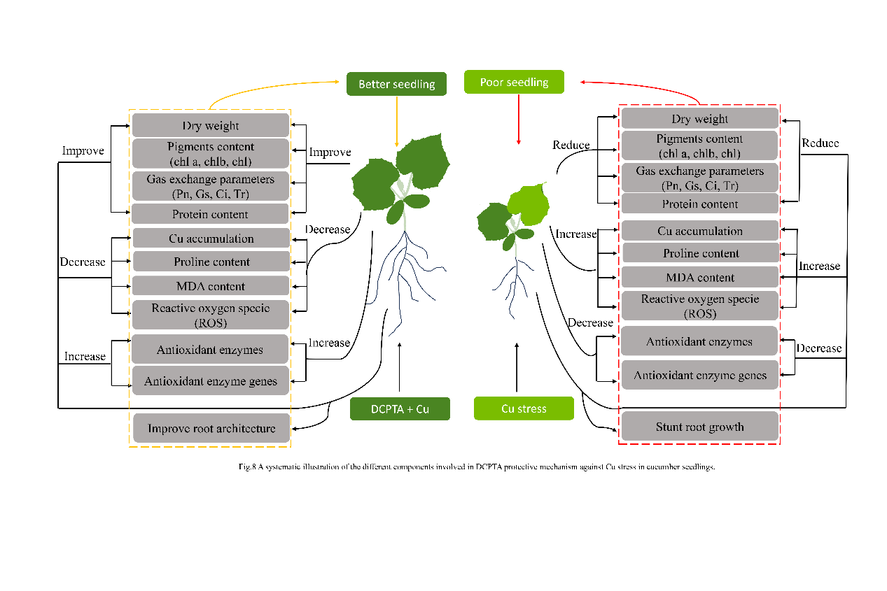 伴随着设施栽培化学肥料的大量使用,大量重金属元素随之进入土壤,设施土壤重金属污染问题逐渐凸显。虽然铜是植物生长所需的微量元素,但超过阈值会对植物生长产生不利影响,导致其在植物内大量积累,随后通过食物链危害人类健康。DCPTA作为一种新型植物生长调节剂,对作物的生长和光合作用具有促进作用,且在植物的非生物胁迫中发挥着重要作用。然而,目前关于DCPTA提高作物对重金属抗性的研究未见报道。本研究以黄瓜品种“中农26号”为对象,首先筛选了铜元素限制植物生长的临界阈值为50μM,DCPTA对黄瓜促生抗逆的作用浓度阈值为0.25 mg/L。随后分别从幼苗生物量积累、根系发育、光合系统参数、抗氧化系统、植株元素分析和转录组分析等多角度验证了DCPTA在提高黄瓜种苗对铜胁迫耐受能力中的作用机制。研究发现,DCPTA主要通过以下方式缓解黄瓜幼苗的铜胁迫:(i)保护光合色素,提高光合能力并促进黄瓜生长;(ii)改变根系结构并减少黄瓜叶片和根部中铜的积累;(iii)调节抗氧化酶并调节相关基因(例如,铜的吸收、运输和解毒;细胞壁成分;氮代谢),从而有效地减轻胁迫。