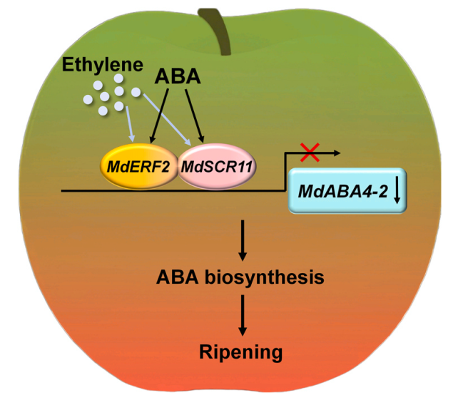 通过苹果果实瞬时表达和‘王林’苹果愈伤转基因体系,发现过表达MdERF2和MdSCR11均能够抑制MdABA4-2的表达,促进‘金冠’苹果果实成熟;且过表达MdSCR11的转基因愈伤中,MdABA4-2的表达显著下调,ABA含量显著升高。该研究揭示了MdERF2-MdSCR11模块通过调控ABA合成调控苹果果实成熟的分子机制(Fig.4),不仅为乙烯和脱落酸在调控跃变型果实成熟中的互作机制提供了新的理论依据,也为今后通过分子育种和采后调控技术延缓苹果成熟衰老、提升果实商品价值提供了重要参考。