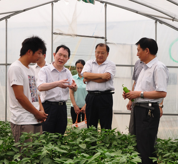 6月7日下午,我校副校长张全国、省教育厅学生处正处级调研员杨占军,在我校招生就业处处长张留湛、我院党委书记耿超明、院长冯建灿等一行的陪同下,来到我院学生王鹏鹏、王继广的创业基地,视察了学生创业经营的西瓜、甜瓜、西红柿、辣椒等瓜菜设施栽培基地。