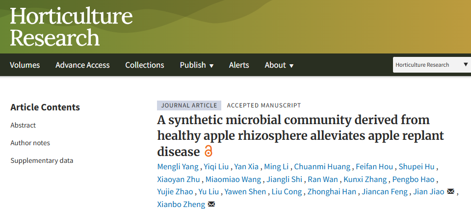 近日,我院苹果逆境生物学与简约技术栽培体系团队郑先波教授、焦健教授在Horticulture Research(中科院一区,影响因子8.5)发表研究论文“A synthetic microbial community derived from healthy apple rhizosphere alleviates apple replant disease”,系统阐明了苹果再植病的微生物驱动机制,并提出以合成微生物群落(synthetic microbial community, SynMs)缓解苹果再植病的新模式。