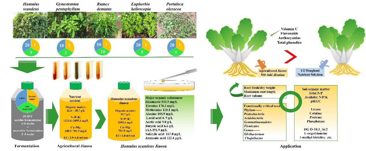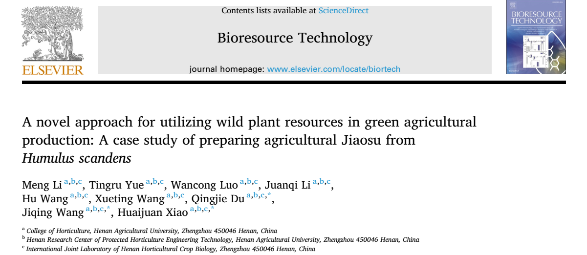 设施蔬菜栽培科技创新团队在环境科学与生态学领域一区TOP期刊《Bioresource Technology》(IF 9.0)上发表了题为《A novel approach for utilizing wild plant resources in green agricultural production: A case study of preparing agricultural Jiaosu from