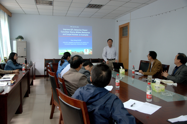 Weng教授以黄瓜霜霉病抗性及心皮数两个性状的QTL定位为例,从QTL定位的实验设计需要考虑的因素、群体构建及群体大小、性状调查及方法、数据处理与分析、到最终的QTL定位及候选基因的验证进行讲述,使老师和同学们了解了目前国际上QTL定位的最新技术及最新发展动态。报告结束后,老师和同学就报告内容各抒已见,与Weng教授展开了热烈的讨论。