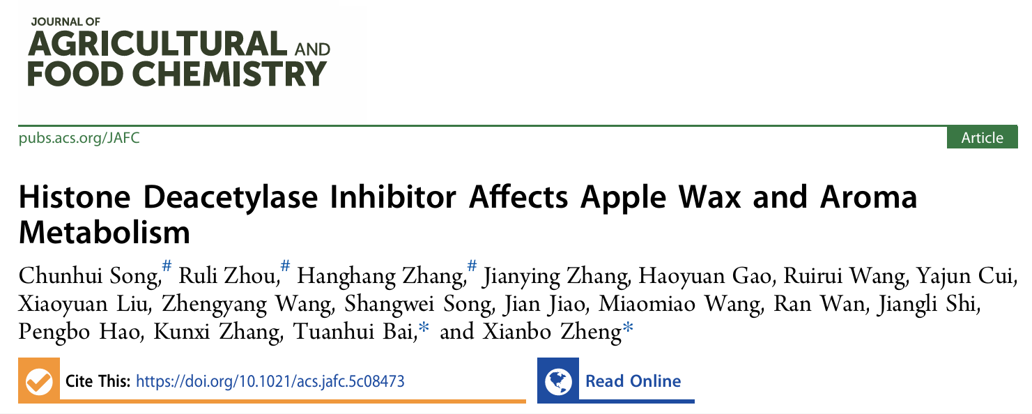 苹果逆境生物学与简约栽培技术研究团队在Journal of Agricultural and Food Chemistry杂志在线发表了题为“Histone deacetylase inhibitor affects apple wax and aroma metabolism”的研究成果,揭示了通过调控乙酰化水平增强苹果果实蜡质和香气代谢,为提升苹果果实耐储藏性与感官品质提供了新策略。