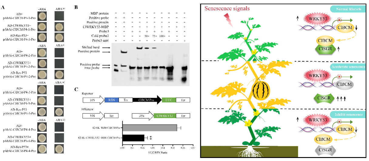 研究团队利用“Royal Golden”衍生自交系WM103与正常材料WT2构建F₂分离群体,结合课题组自主开发的5K西瓜液相芯片进行BSA-seq分析,将候选基因初步定位在10号染色体上。进一步通过分子标记将区间缩小至86.63 Kb,最终确定该基因编码一个BALANCE OF CHLOROPHYLL METABOLISM(ClBCM)蛋白。为验证其功能,研究人员采用VIGS和CRISPR/Cas9基因编辑技术,分别对ClBCM进行瞬时沉默与稳定敲除。结果表明,无论是沉默株系还是敲除突变体,均表现出典型的早衰表型,叶绿素含量和光合能力均显著下降,表明ClBCM在维持叶绿素稳态和延缓衰老中发挥着重要作用。同时确认与衰老相关的WRKY转录因子家族的多个基因在早衰突变体中差异表达,进一步通过实验验证发现正向调控衰老的转录因子ClWRKY53可直接结合ClBCM的启动子调节其转录。此外,蛋白互作分析发现ClBCM与ClSGR存在直接互作,协同调控体内叶绿素稳态。