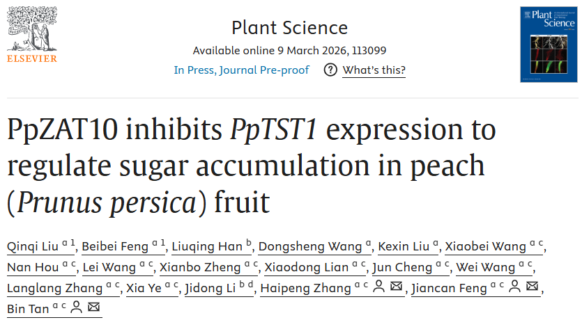 桃生物学与种质创新团队在Plant Science杂志在线发表了题为“PpZAT10 inhibits PpTST1 expression to regulate sugar accumulation in peach (Prunus persica) fruit”的研究成果,在桃果实可溶性糖积累机理研究方面取得新进展。